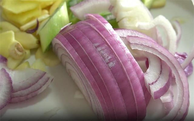 3.准备生姜,切成姜片,再准备一把大蒜,切成片,准备一段大葱,切成葱花,再准备一个洋葱,切成细丝,切好放入盘中备用。