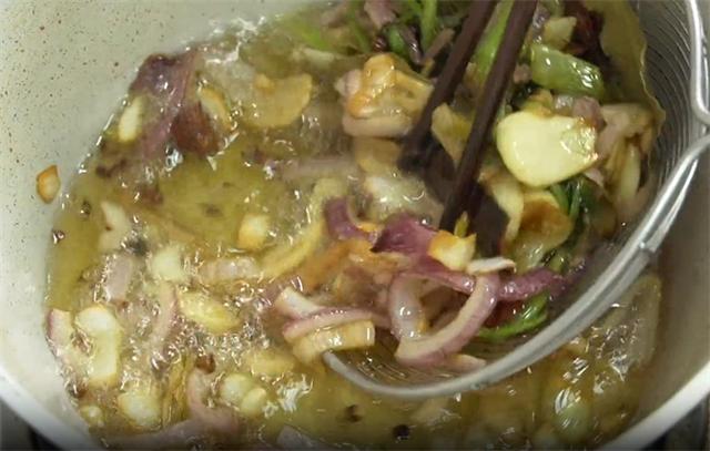 6.锅里面多倒一点花生油,咱们在炸东西的时候尽量使用花生油,做出来的辣椒油特别香,油温烧至5成热的时候,把葱姜蒜、洋葱放进去炸,再加一颗香菜,炸的过程中用筷子不停的翻动,要把里面的水分炸干,炸到食材微黄时,再把大料放进去,让大料的香味完全释放出来,现在已经闻到香味了,像这样就可以了,把它捞出来控油。