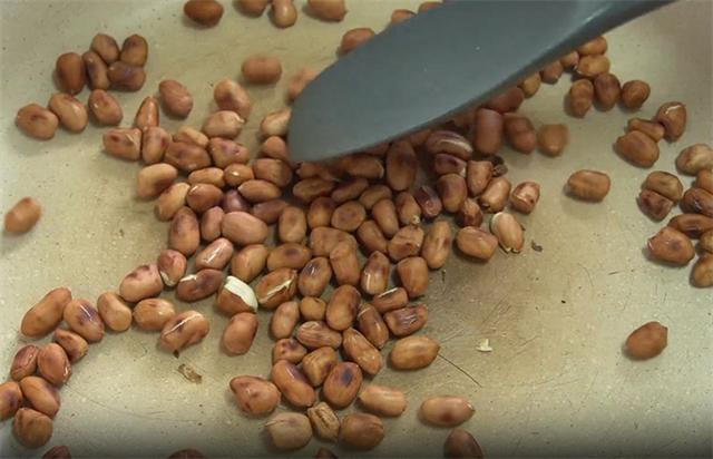 2.接下来我们准备一碗花生米,倒进锅里面,开中小火把花生米炒一下锅,里面不用放油,直接干炒就可以,炒到锅里面能听到噼里啪啦的声音,而且花生米的外壳也微微裂开,像这样就可以了,把它盛出来,稍微放凉。