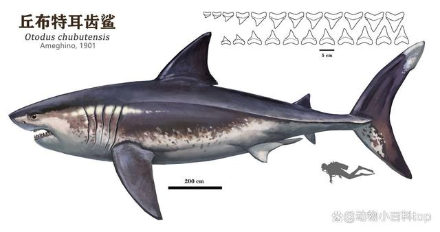 丘布特耳齿鲨属于史前时期最著名的十大鲨鱼之一,其生活在大约2800万年前至500万年前。科学界对于丘布特耳齿鲨的大小估计存在一定的范围:激进估计将其身长界定在14至15米之间,而更为保守和可信的估计则是大约13米。这种鲨鱼的牙齿长可达129毫米,在鲨鱼家族中以其咬合力强大著称,仅次于巨齿鲨,它们以海龟、海豹乃至鲸类等大型海洋生物为食,显然是它所在时期的海洋顶级掠食者。然而,丘布特耳齿鲨的强敌包括其他海洋巨兽,如同期的巨齿鲨和梅氏利维坦鲸。在其历史的后期,面临着愈发激烈的生存竞争,加之它们本身的独居习性,丘布特耳齿鲨在这场史前生存的战争中渐渐失去优势,最终导致其种群的消逝。 5、耳基拟噬人鲨
