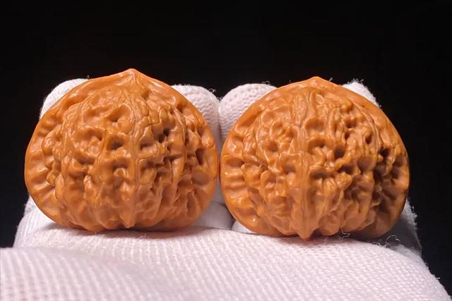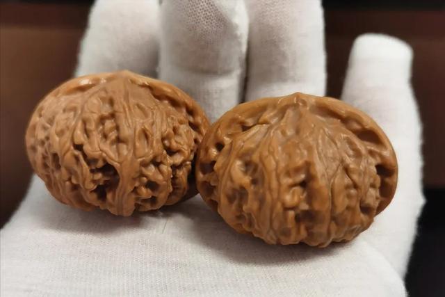具体是谁变的就不管它了无从考证,后来为了好卖这个核桃长得又像古代宫女拿的灯笼,于是就换成了宫灯这个名字,所以宫灯是个嫁接品种,没有原生老树这么一说,这款核桃基本都是中矮桩的,一种是桃心形状,桩型偏高一点,另一种是超矮桩,有点扁,整体特征是溜肩膀十字尖大宽边,棱子比较粗壮,鼓肚子大底座通体圆润饱满,老款宫灯的纹路比较深,而且比较粗壮。