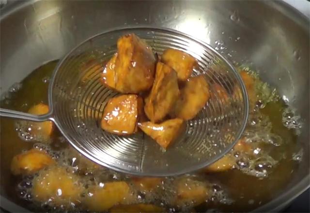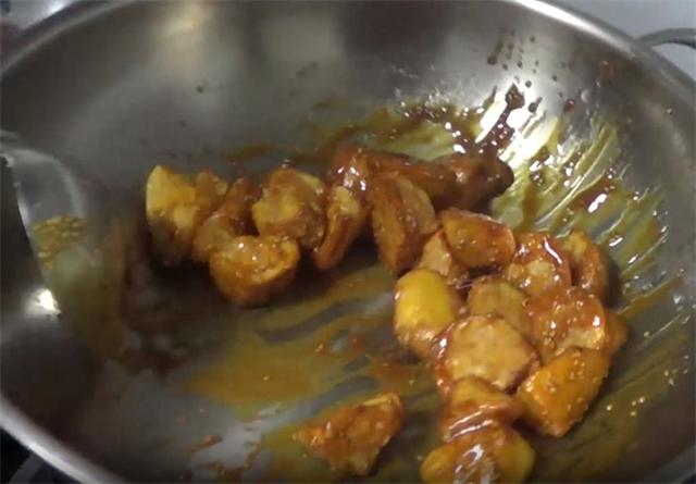 3.炸好之后,我们把油倒出,锅中不要再加油或者是水,直接加入一大勺的白糖,我们开始炒糖浆,这里炒糖浆有一个小技巧,那就是直接用小火慢慢的炒,不要加大火,只要小火,我们看好糖浆的颜色,颜色变红了就可以。