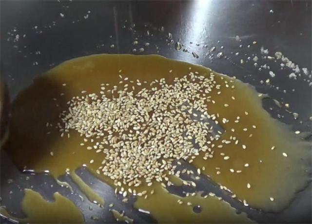 4.变红之后加入白芝麻或者是黑芝麻,下入地瓜就可以了,快速的翻炒均匀就可以出锅了,用小火的好处就是我们不用去观察糖浆的气泡变大或者是变小之类的,这样我们大家都可以做的很好。