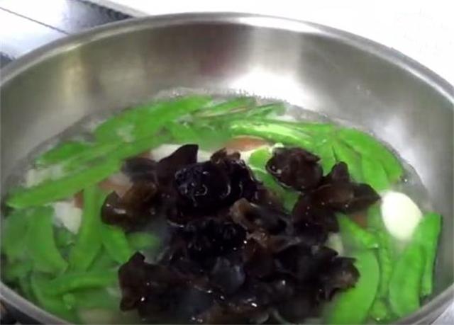 3.锅中加水,水开了之后,我们依次把山药和荷兰豆下锅焯水,下入荷兰豆之后,我们加入一小勺盐,然后再把胡萝卜下水,水开之后,再把木耳下锅焯水一分钟就可以盛出了。