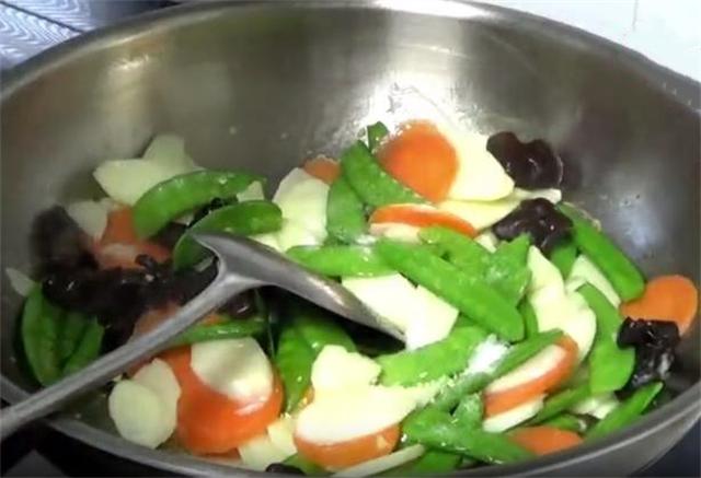 准备食材: 山药、胡萝卜、荷兰豆、木耳、大蒜、盐、食用油、味精、素蚝油 具体做法: