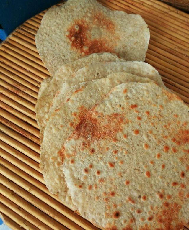 然后都擀成薄饼,越薄越好,擀好的薄饼放入预热好的电饼铛中,每一面烤2-3分钟。
