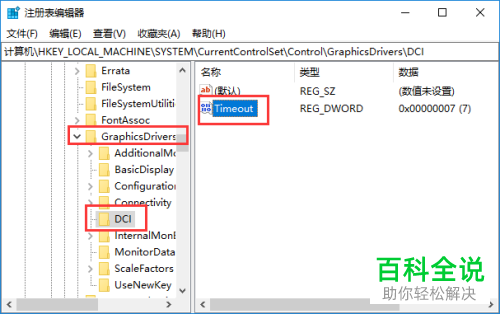 3. 依次打开:HKEY_LOCAL_MACHINE\SYSTEM\CurrentControlSet\Control\GraphicsDrivers\DCI,然后在右侧找到Timeout双击;