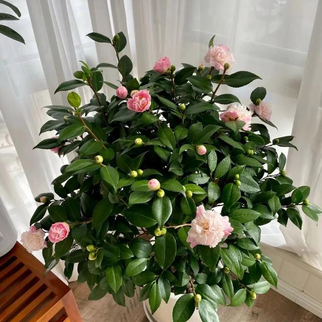 长寿花名字就寓意着长命百岁,特别吉利。它的花朵小小的,密密麻麻的,颜色也特别鲜艳,有红的、粉的、黄的,就像是一个个小灯笼,特别喜庆。 可是啊,有时候它就是不开花,出现只长叶不开花的情况,怎么办呢?给他套个袋也好使。原因是长寿花是短日照植物,在这样的环境中,更容易进行花芽分化,所以晚上套黑袋子,白天拿下来,不出几周就能开开心心的开花了。 茶花