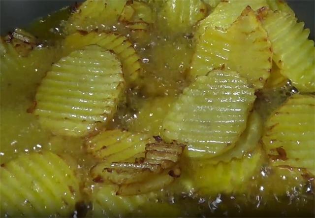 3.起锅加多一点的油,油六成热时,把土豆片下锅先炸一下,土豆炸熟,四周金黄的时候就可以捞出了。