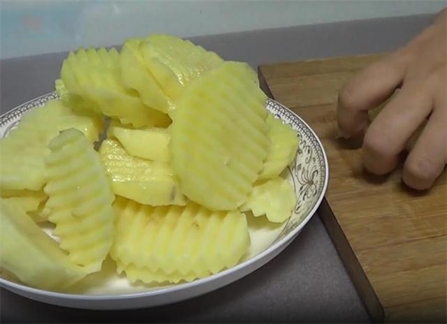 2.然后准备两个去皮洗净的土豆,用刀或其他工具切成厚一点的片,切好之后,装盘备用。