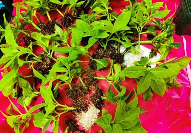 绣球花的繁殖方式同样以扦插为主,但需要注意的是,扦插的最佳时间是在梅雨季节或春季萌芽前。选取一根生长健壮的嫩枝作为插穗,长度在15厘米左右,保留2-3个节点,并去掉下部的叶片。扦插前可以将插穗基部蘸上生根粉,然后插入湿润的沙床或珍珠岩中。 保持基质湿润,并适当遮荫,大约半个月左右就能生根成活。