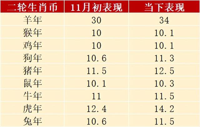 可以看到,和11月初的表现进行对比,所有二轮生肖币,都出现了长足的进步。 尤其是龙头二羊、虎币和兔币,特别出色。