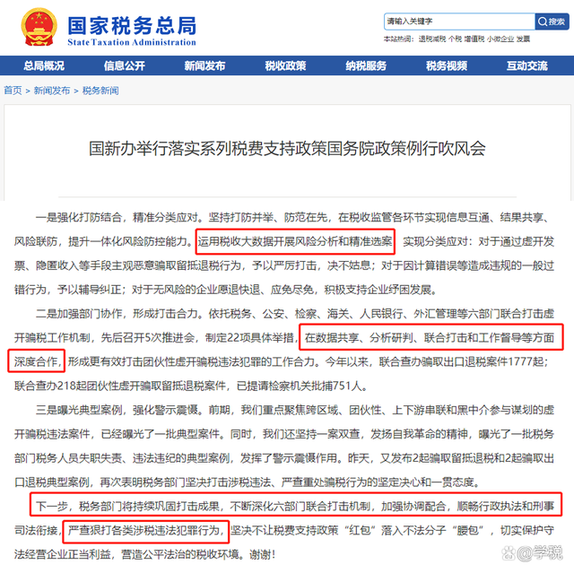 国家税务总局最新表态:以零容忍的态度狠打涉税违法犯罪行为,营造公平的税收环境,保护守法企业经营。下一步,将深化六部门合作,继续严查狠打各类涉税违法犯罪行为。 那么,税务部门是如何打击涉税违法行为的呢?在这个会议上,也给出了明确答案,我们简单给大家划下重点: 1、打防结合,精准分类。 现在税务部门内部已经构建了一套一体化的风险防控机制,在税收监管各个环节已经实现了信息互通、结果共享和风险联防。而税收大数据的应用,则让税务局实现了精准分类和监管。 2、对于涉税违法行为并不是一刀切,而是分类应对。 对于主观上的偷税、骗税行为,诸如虚开发票、隐匿收入等,直接零容忍,露头就打。而对于因为计算错误等非主观上的一般涉税违法行为,则以辅导纠正为主。 3、部门协作进一步深化和加强。 税务、公安、检察、人民银行等6部门联合打击虚开骗税的机制已经越来越完善,而且取得了较大成果。6部门的数据共享和联合打击合作机制,在未来还将进一步加强。 4、曝光典型,一案双查。 通过曝光涉税违法行为的典型案例,一方面对想动歪脑筋的企业形成警示和震慑,另一方面也有助于企业对一些涉税风险的防范。 同时,税务稽查不仅查企业,还会查相关的税务人员,即一案双查。通过内部关系走门路进行涉税违法行为的操作,也是完全行不通了。 而这些,仅仅是税务稽查的一个开始。随着年底金税四期的建设完成,以及未来金税四期、智慧稽查等系统的上线应用,税务稽查将更加精准和智能,并且未来很长一段时间内,“严征管”将成为常态。 在“严征管”趋势下,企业的一些预警指标出现异常,税务机关可能随时上门检查。这些异常指标包括但不限于:发票数据异常、税负率变动超过20%、预收账款占销售收入比例异常、税前扣除超限额等等。 一般而言,税务局稽查企业,会从合同、发票、资金流以及上下游等多个方面入手: 比如合同方面,会查验是否有完备的合同、协议,合同的具体内容是否符合企业的实际经营情况,是否存在异常交易情况。 比如发票方面,查验发票内容是否与企业经营范围相符,是否有买票抵税的行为,是否虚开的行为等等。 比如资金流方面,查验资金流向是否真实、正常,尤其重点查验有无异常回流情况。 我们建议企业最好能实现发票、合同、资金、物流等四流一致,并且有完整、真实的证据链,避免因此产生涉税风险。 严稽查的背景下,想要不让税务局找上门,合规、合法经营必不可少,诸如虚开发票、隐匿收入、虚列成本、骗取留抵退税、骗取出口退税、违规公转私、违规享受税收优惠、长期零申报或不申报,以及税负率异常都将是接下来的稽查重点,企业一定不要有这些行为了。 最后,更多企业涉税风险及规避内容,可以看下专栏: |