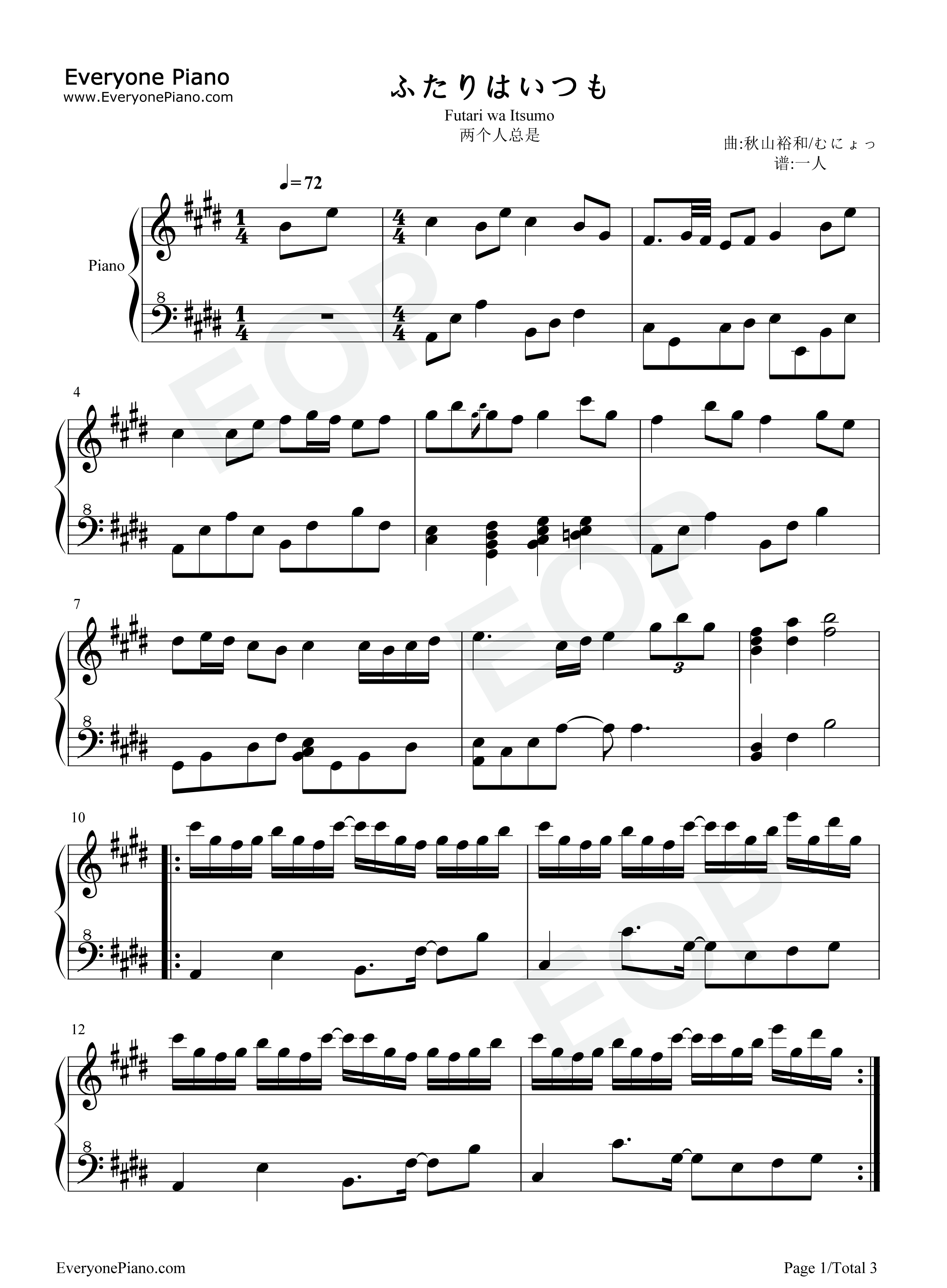 由EOP大佬_一人_给大家编配,曲子有点难,学过《魔鬼训练营》的小伙伴要多加练习哦! 两个人总是,日语ふたりはいつも,是秋山裕和创作的曲子,同时也是《美少女万华镜》的背景音乐。《美少女万华镜》是由ωstar制作的系列超自然学风格官能AVG游戏,该游戏于2011年12月29日在PC上发行,原画师八宝备仁。目前已经发售了五部作品,分别是第一话《美少女万华镜 -被诅咒的传说少女-》,第二话《美少女万华镜 -勿忘草与永远的少女-》,外传(第2.5话)《美少女万华镜 -致曾经是少女的你-》,第三话《美少女万华镜 -神明创造的少女们-》,第四话《美少女万华镜 -罪与罚的少女》。 |
