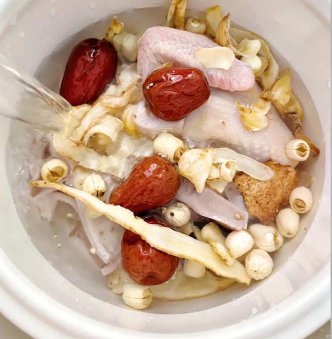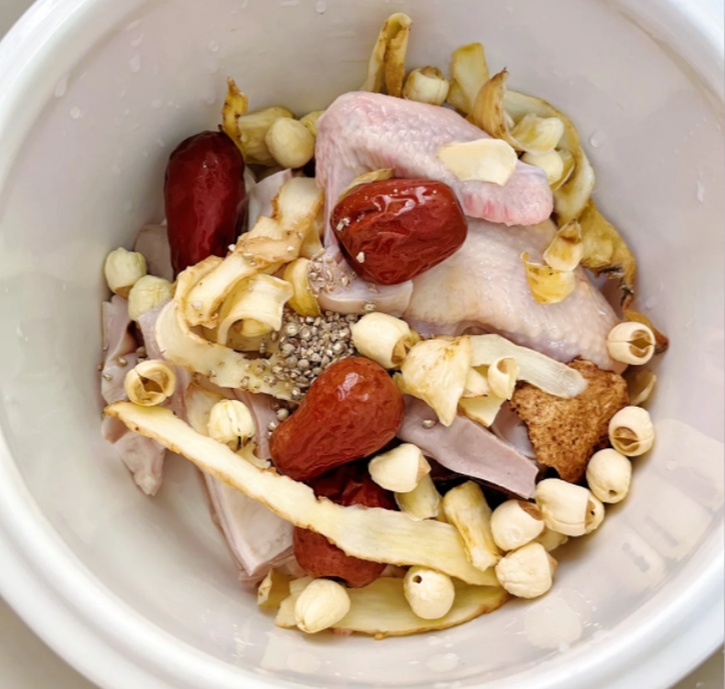 第六步:准备好煲汤的器皿,分别放入猪肚,鸽子肉,陈皮,莲子,红枣,玉竹和老姜,加上纯净水漫过食材。