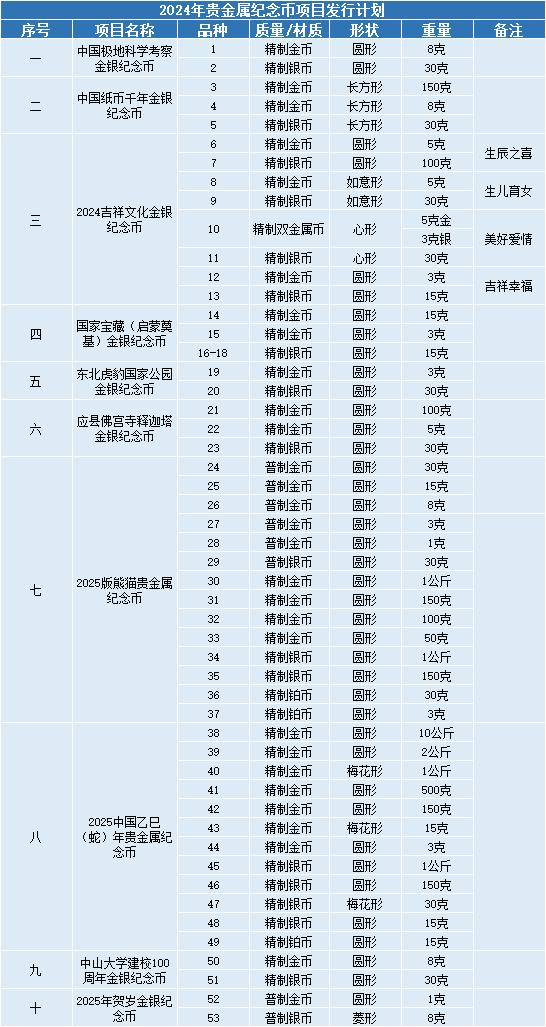 最后1枚就是第二枚京剧纪念币了,它的面值是5元,也是我国第三枚彩色币。 有大火的首枚京剧币珠玉在前,它也会成为明年不能错过的普通币! 这枚大概率是旦角币的新币,预计在明年11月发布公告。 贵金属币亮点颇多在2023年,我国计划发行的贵金属币,一共有62枚。 考虑到这几年金银币整体遇冷,发行种类和发行量也是持续缩减中。 今年的缩减幅度巨大,项目依然是十个,但数量只剩下53枚,具体发行计划如下。