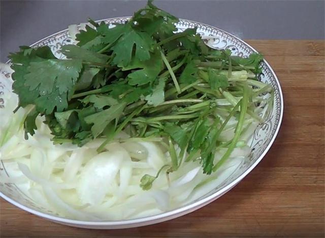 2.再准备一个洋葱对切,再用刀切成薄一点的片,切好之后,用手全部分开,然后装盘备用,再准备一把香菜,切成段,然后和洋葱放在一起。