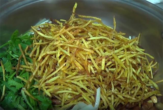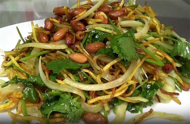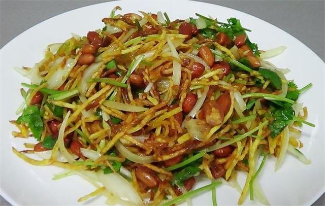 5.炸好之后,我们准备一个盆,把洋葱和香菜放进去,再把花生米加进去,然后加适量的盐,少量的味精,再加一大勺白糖、一勺香醋、一勺酱油、少量的香油,最后把土豆丝放进去,然后搅拌均匀,这样三丝爆豆就做好了。