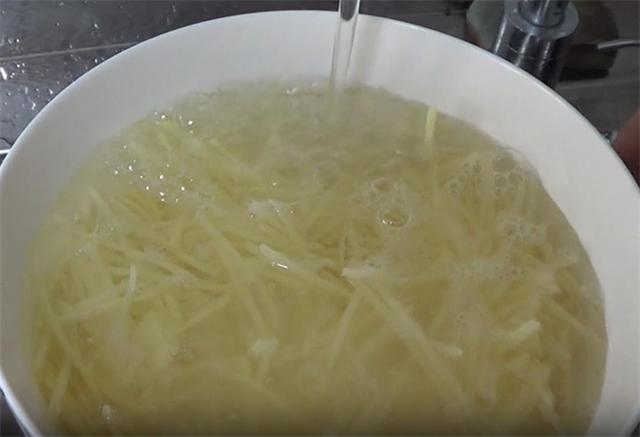 1.朋友们大家好,今天我们来做一道非常好吃的凉菜,三丝爆豆,做法其实很简单,不过味道却是非常好的。首先准备两个土豆,然后把土豆切成丝或者擦成丝,这是处理好的土豆丝,再用水把土豆丝泡上。