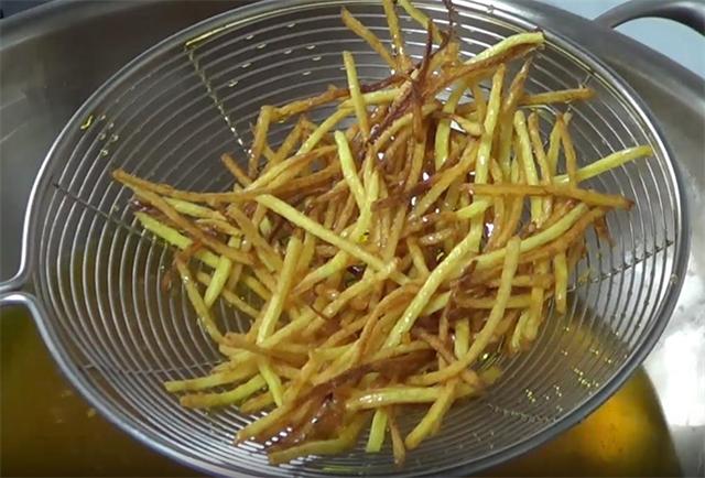 4.准备好之后,土豆丝沥水备用,然后起锅加多一点的油,大火加热,当筷子伸进去之后快速冒泡,就可以把土豆丝下锅了,土豆丝要少量分多次下锅,下锅之后用筷子快速的搅动,防止粘连,炸土豆丝一直用大火就可以,炸至土豆丝变硬金黄就可以盛出了,到这样就OK了,然后装盘备用。