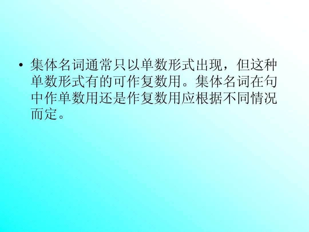 集合名词谓语动词可以用为单数或复数,这类集合名词包括family(家庭),team(队),class(班),audience(听众)等,其用法特点为:若视为整体,表示单数意义;若考虑其个体成员,表示复数意义。 具体介绍 通常用作复数的集合名词 police(警察),people(人),cattle(牛,牲口)等集合名词,总是表示复数意义,用作主语时,其谓语要用复数: 【注】goods(货物), clothes(衣服)只有复数形式,且只表示复数意义: 只用作单数的不可数集合名词 clothing(衣服),poetry(诗歌),baggage / luggage(行李), furniture(家具),machinery(机械),scenery(景色),jewellery(珠宝),equipment(设备)等集合名词通常只用作不可数名词,表示单数意义,用作主语时,其后谓语动词用单数形式: 既可表示单数意义也可表示复数意义的集合名词 family(家庭),team(队,队员),class(班,班上的全体学生),crowd(人群),government(政府),crew(乘务员),committee(委员会),audience(听众),public(公众)等集合名词,当它们表示整体意义时,表单数意义,当它们强调个体意义时,表示复数意义:【注】有时没有特定的语境,用单复数谓语均可以。