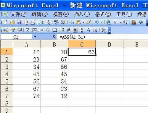 4、如果利用前面的方法,我们可以先计算两列数之差,再来求绝对值,这里我们只要在c1中输入=abs(b1-a1)或=abs(a1-b1)即可;