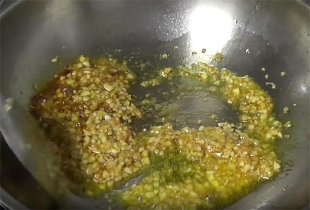 4.然后切多一点的蒜末装碗备用,接着起锅加多一点的油,油热之后我们加入蒜末炒香,炒香之后倒入最重要的素蚝油,可以加多一点,然后炒匀,炒匀后加少量的水,把蒜末煮一分钟,然后再加少量的白糖炒匀,加入盐、味精调味,再加少量的酱油翻炒均匀,蒜蓉就做好了。