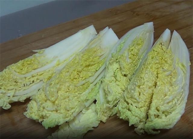 2.再准备一颗娃娃菜,然后对切,再切成三份,一共切成6份,切好备用。