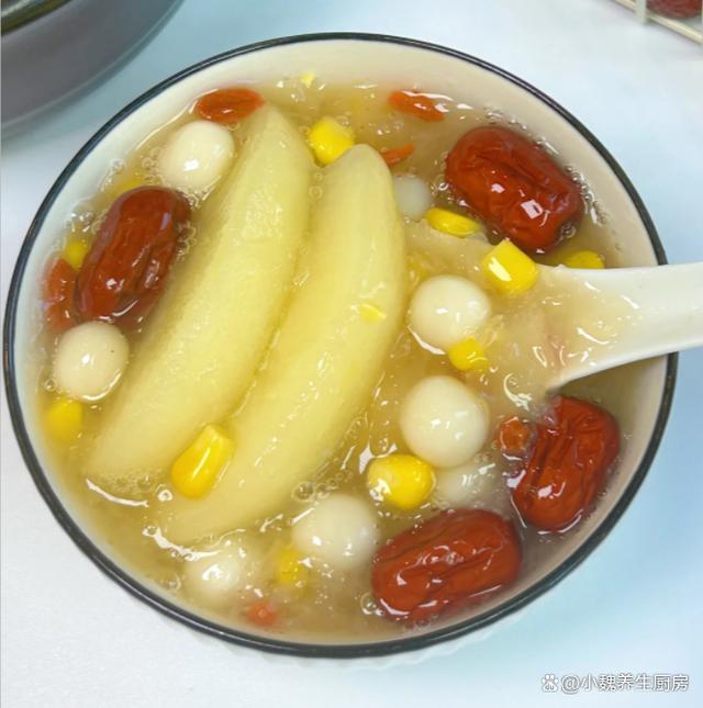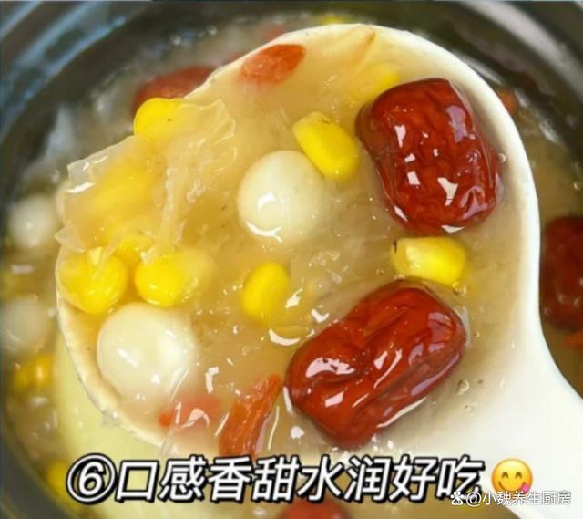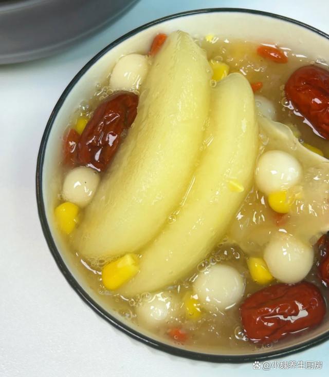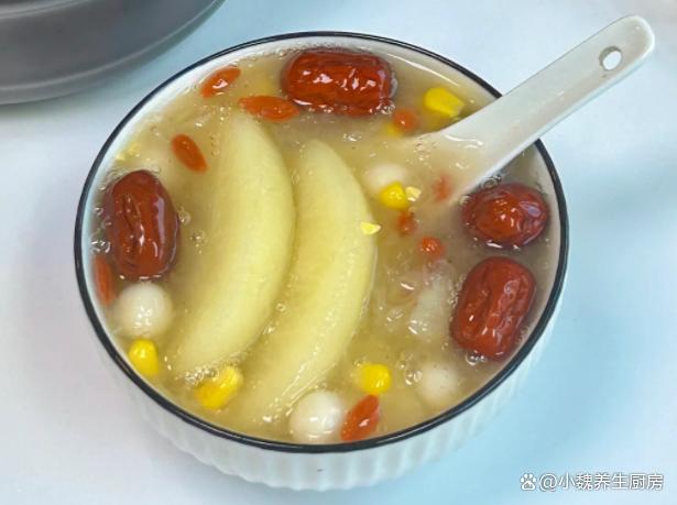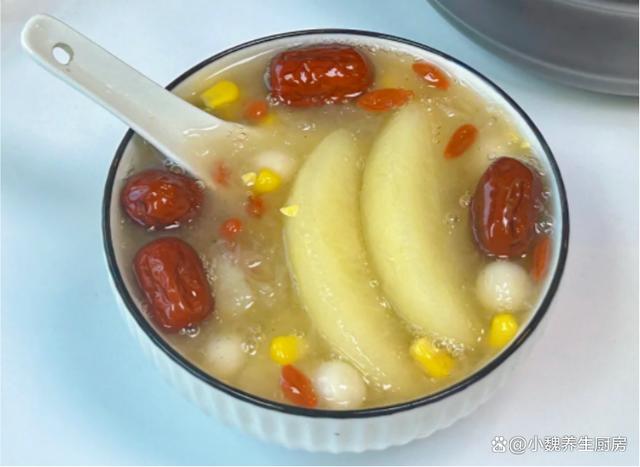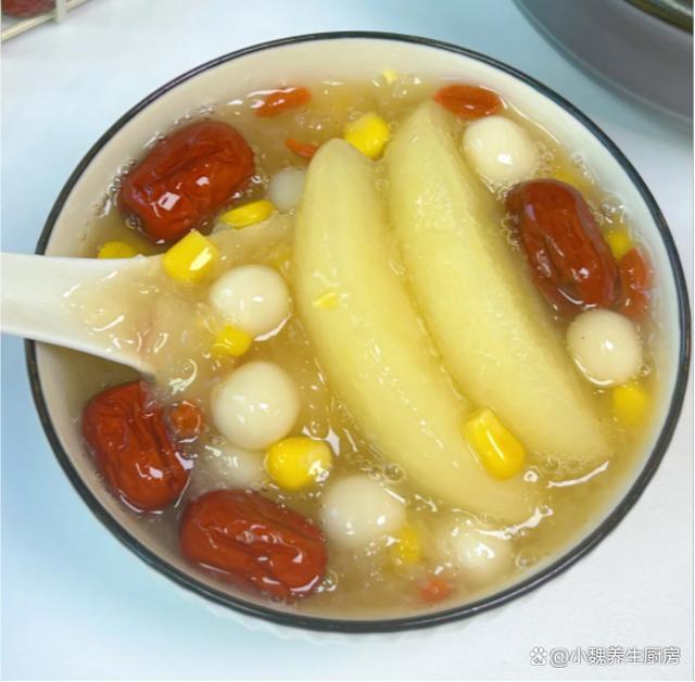 到了深秋,秋季是非常舒服的时候,由于天气变化太快,身体出现不适,气虚体弱,四肢都无力,女性容易出现贫血,气色苍白,身体一天不如一天。人上了年纪,皮肤会非常干燥,容易长皱纹,平常喜欢去美容院,但是效果都不理想。爱美是女性天性,都想要留住青春,这个时候想要抵抗衰老,需要经常吃水果,为肌肤补充水果,还可以剁成高铁高维生素的食材,比如说银耳。银耳素有“平民燕窝”之称,可以搭配各种水果,简单炖一锅,汤品非常浓稠,滋润肌肤,延缓衰老,改善我们的气血,常喝能够美容养颜。入秋后,女人要多喝这汤,暖胃养胃,补气补血,肌肤更显白嫩!编辑 搜图 【苹果雪梨玉米红枣银耳羹的详细步骤】