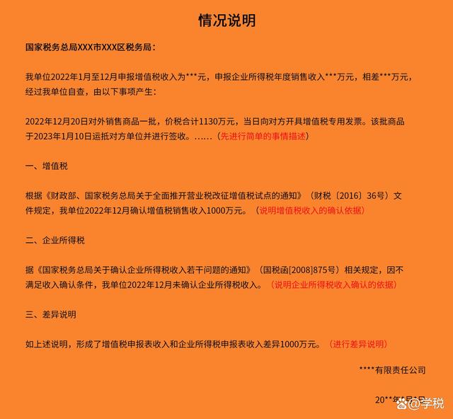 突然接到税务局的风险预警,大致是:企业在某个期间内,企业所得税收入和增值税收入不一致,要求企业据实自查,是否存在少申报收入的情况,并在规定的期限内提交自查反馈。 很多会计第一次接触到这样的预警信息可能会有点发慌,其实大可不必。因为,收到这样的信息并不是代表企业一定有问题。通过系统自动比对出来问题,税务局人员找到企业询问、核实情况,很常见。 正常情况下,企业所得税收入和增值税收入是趋同的。但是,由于税法上有一些特殊的规定和要求,所以很多时候,二者可能也会不一致。 比较常见的有提前开票导致的企业所得税收入和增值税收入不一致,比如: 小明公司,增值税一般纳税人,在2022年12月15日销售了一批货物给小白公司,价税合计1130万。小明公司在12月15日开了专票给小白公司。但是货物需要运输,直到2023年1月5日,小白公司才收到货并进行了验收入库。 如上,小明公司在2022年12月提前开票,增值税纳税义务已经发生,所以2022年12月确认了增值税收入1000万元。但货物交付时间是2023年1月,小明公司无法在12月确认企业所得税收入。 这种差异,属于纳税义务时间导致的,属于正常现象,不需要人为调整。 一般情况,像委托代销、租赁服务、预收款方式销售大件货物、托收承付方式销售货物等,都有可能因为纳税时间不同,造成增值税收入和企业所得税收入上的不一致。另外,企业在处置固定资产、无形资产,金融品转让业务中,也会发生增值税收入大于企业所得税收入的情形。除此之外,还可能会因为价外费用差生企业所得税收入和增值税收入的不一致。 作为企业遇到这样的风险预警,处理方式也并不复杂,找出差异情况,如实反馈说明就行。如果税务局对你的说明认可,这件事就过去了。 一般的思路就是,先对事情本身做一个简单的描述,然后说明增值税收入的确认依据,再说明企业所得税的收入确认依据,最后对差异进行说明即可。我们顺便在这里也给大家整了个情况说明的模板,供大家参考: 值得大家注意的是,当下随着金税四期的临近,以及一些数据化、智能化手段的应用,税务系统的各种预警模型会不断丰富和强化,有可能之前没有被发现的涉税风险,现在会被发现。 在以“数”治税下,未来可能越来越多的企业会收到类似的风险预警信息。建议企业平时做好各类风险的核查,并认真对待每一个涉税数据,减少涉税风险的发生。 最后,以上内容,仅供大家参考和学习,不作为实务操作依据。如有不足,恳请赐教。 |
