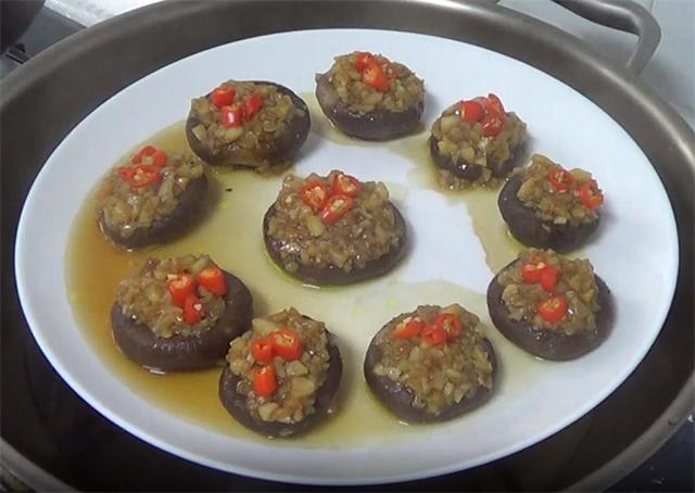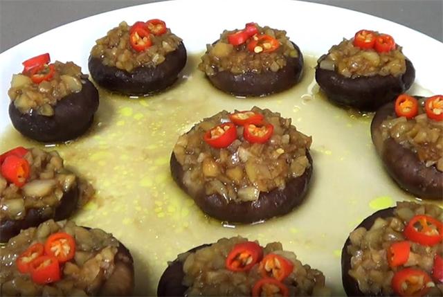 5.炒好之后,把蒜蓉放在香菇上,放好后,在上面加几个小米辣。