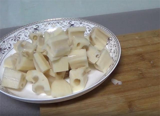 1.朋友们大家好,今天我们来做一道很好吃的糖醋藕丁,酸甜适口,藕丁脆嫩,还很有营养。首先取一个去皮洗净的藕,切成段,切断之后,再切成丁,切好之后装盘备用。