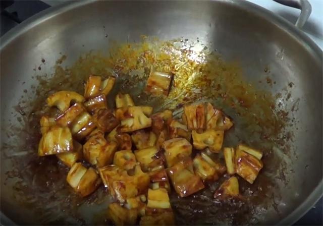 4.然后另起锅加入少量的油,油热之后下入藕丁,快速的翻炒均匀,炒匀之后,把调好的糖醋汁下锅,一直大火翻炒收汁,让藕丁挂满糖醋汁,汤汁快干时,淋入少量的水淀粉勾芡,炒匀就可以出锅了。