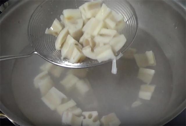 3.起锅加多一点的水,水开之后下入藕丁,然后再次把水烧开,如果喜欢吃脆一点的煮五分钟,如果喜欢吃软糯一点的煮十分钟,煮好之后捞出沥水备用。