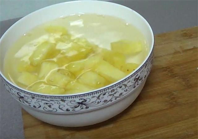 2.准备一个菠萝,取半个切成小块,切好之后放入盐水中去掉菠萝酶。