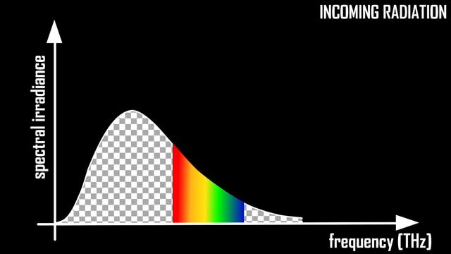 事实上,温室效应并不那么简单,这次我们添加一些物理知识,使我们对温室效应的理解更加完整。阳光包含许多不同的频率,频率与光子的能量成正比,所以频率越高意味着能量越高。频率与光的波长成反比,波长越长意味着能量越低。 如果将能量绘制为其频率的函数,则可以得到所谓的光谱,下图就是所谓的太阳光谱。但这个光谱的形状并不是特定于太阳的,任何恒定温度下物体的光谱都有像这样的形状。温度越高,频谱向更高频率移动的越多,发射的能量越高;温度越低,发射的能量越少,这就是普朗克定律。如果你知道温度,那么普朗克定律会告诉你发射什么频率的光,以及总共发射多少能量。
