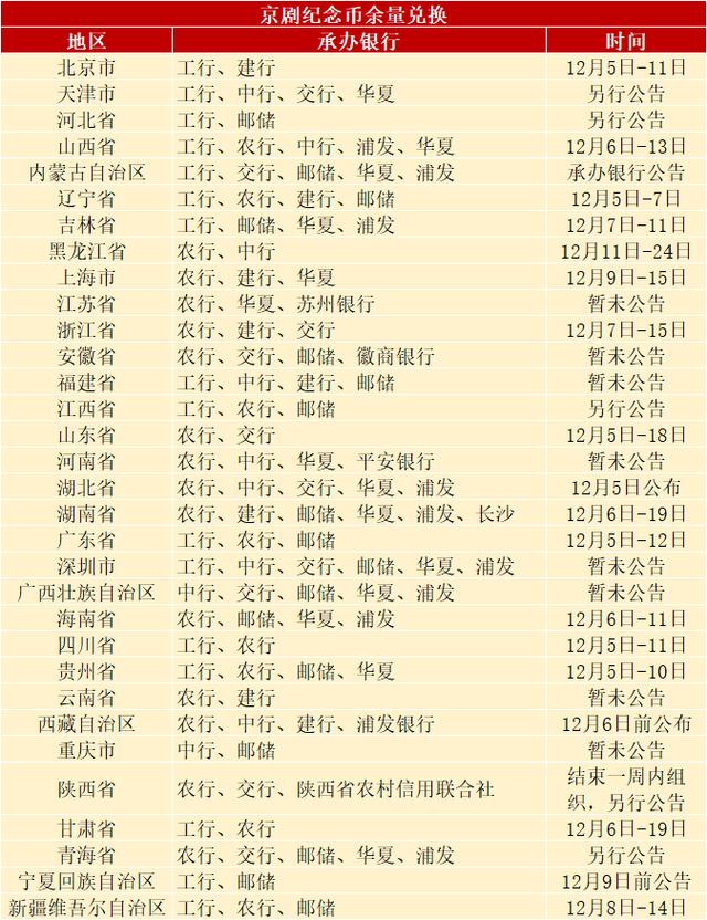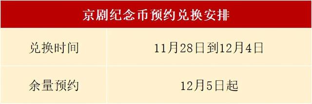 这枚纪念币的兑换将在12月4日结束。 不过紧接着,全国各地会在12月5日起,陆陆续续开展余量兑换工作。 目前,已有大部分地区公布了余量预约安排。 京剧币的余量预约近几年来,普通纪念币的余量预约,不再全国同一时间进行,而是由各地自行决定预约时间和预约方式。 京剧币也不例外。 从目前各地公布的安排来看,预约时间有长有短,开始的日期也不一样。百科网查阅了全国各地所有的公告,整理了一份表格,供大家进行参考。