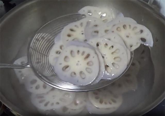 2.然后起锅烧水,水开之后把藕片下锅,再次把水烧开,然后再煮三分钟就可以捞出了,捞出之后,用清水冲洗一下,去除藕片表面的淀粉,控干水分。