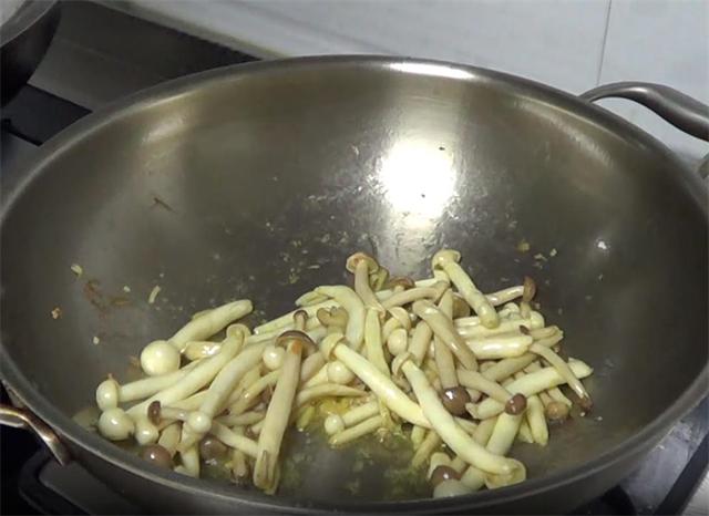 2.捞出之后另起锅,加稍多一点的油,油热之后下入蒜爆香,然后把洗净的蘑菇下锅,蘑菇要炒的久一点,要翻炒出水,让蘑菇变软。