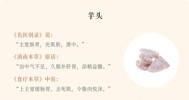 芋头之所以能“充肌肤”,主要是因为它能强健脾胃,脾主肌肉,胃经又是多气多血的经络,脾胃好了,气血也足,自然就中气十足、脂肉悦泽; 现代营养学把这层黏液叫做黏液蛋白,经过消化吸收后会产生免疫球蛋白,能提高自身抵抗力;里面的黏液皂素又能像胃中的黏液一样,保护胃肠、润滑肠道。 其实,这些都是身体里的痰气郁结的产物。比如你生气了、抑郁了、焦虑了,导致肝气郁结,让你胸口堵、胃胀、两肋胀痛刺痛、小腹部胀痛; 除了瘰疬,小孩的慢性扁桃体炎、腺样体肥大,还有现在很多人肺里、甲状腺、乳房、卵巢、子*长东西,也是这样来的! 但是半夏和天南星都不是食物,并且都有小毒,唯有芋头是药食同源,因此在化痰散结的食疗榜上,他是扛把子,始终被人模仿,却一直无法超越。 现在很多人脾胃虚、气血虚又身体淤堵,痰瘀不容易化散,建议经常吃点芋头,蒸着吃,煮着吃,炖着吃、做点心都好,每次吃100~200克,贵在坚持,脾胃调养需要一个过程,身体里的疙瘩也需要一点点化散! “扫除白发黄精在,君看他年冰雪容”,这是诗圣杜甫赞美黄精的诗句,杜大诗人希望黄精能帮他扫除白发、保持容颜、恢复年轻! 因为黄精获天地之淳精,得坤土之精粹,被称为“土地之精”、“仙人余粮”,曾是风靡修仙界的超级网红,上能养肺,中能补脾,下能滋肾!