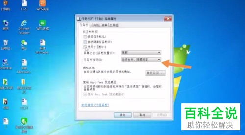 6. 还有一种情况就是任务栏被隐藏了,那么请大家先点一下任务栏,然后右击后选择其中的“属性”,接着点一下如图箭头所示的区域进行设置,操作完成。
