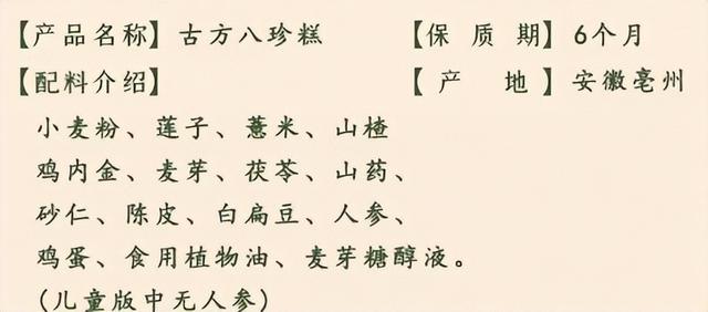 在配方上,我们家的这款八珍糕不添加任何添加剂,这点在我们的配料表上便能清楚知悉,在配料表中这款健脾八珍糕所用的食材为优质的山药、茯苓、莲子、山楂、麦芽、鸡内金、薏米、人参(儿童版中无人参)与砂仁。