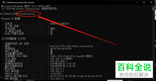 2. 第二步打开【cmd】窗口后,根据下图箭头所指,在命令行中输入【ipconfig/all】并按下【回车】键。