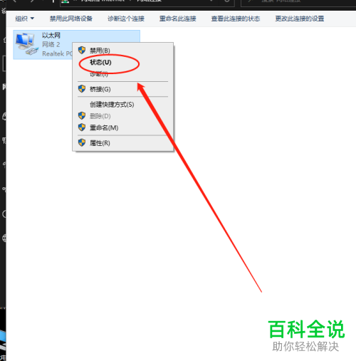 3. 第三步鼠标右键单击【以太网】图标,在弹出的菜单栏中根据下图箭头所指,点击【状态】选项。