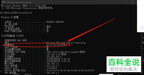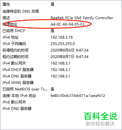 3. 最后在弹出的信息列表中,根据下图箭头所指,找到【物理地址】,这就是MAC地址。