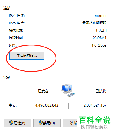 4. 最后在【状态】窗口中,根据下图所示,点击【详细信息】选项,找到【物理地址】,这就是MAC地址。