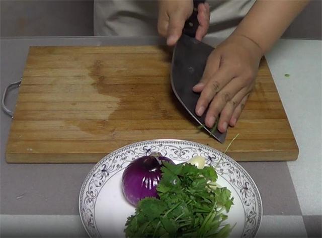 3.接着把香菜切成段,洋葱取半个切碎,把蒜切成蒜末。
