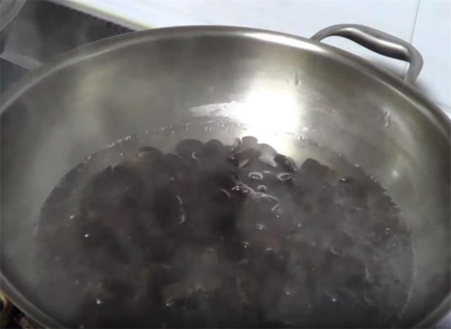 2.然后烧水,水开之后下入木耳,再次煮开之后,煮3到5分钟就可以把木耳捞出了,捞出之后,放入冷水中。