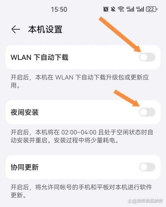 五、关闭软件自动更新 软件自动更新在某些时候可能会给我们带来困扰。一方面,它可能在我们不知情的情况下消耗大量的流量;另一方面,有时候新的软件版本可能并不稳定,甚至会导致手机出现卡顿等问题。 首先,在设置中找到 “软件更新”,点击进去后,再点击右上角的设置图标。在这里,把 “WiFi下自动下载” 和 “夜间安装” 两个开关关掉。这样就可以防止手机在自动下载更新,我们可以根据自己的需要手动选择更新软件的时间和版本。