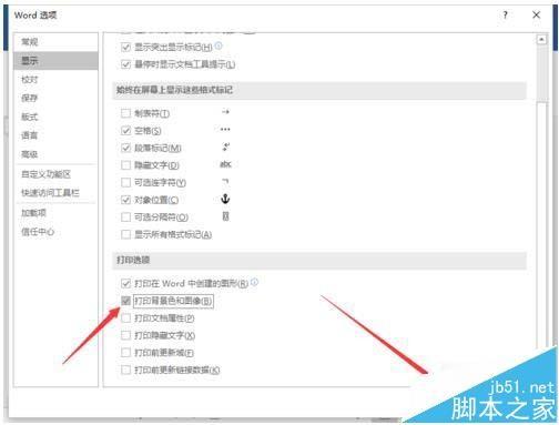 6、在“显示”选项卡栏的右侧窗格中,找到“打印选项”区域下的“答应背景色和图像”选项,并将其勾选即可。如图所示;